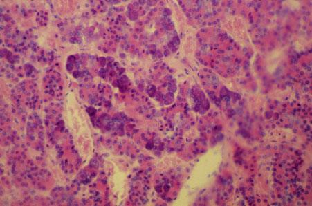X-52 (5) Slide 91, Pituitary Gland (H&E). High power view of pars distalis. Acidophils (pink), basophils (dark purple) and chromatophobes (light staining) can be identified. Cells are arranged in arched clusters.