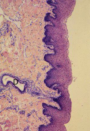 VII-6 (4) Slide 42, Lip. Medium power view. Lamina propria with a duct of labial gland and skeletal muscle fibers (cross-section), and stratified sqamous nonkeratinizing epithelium.