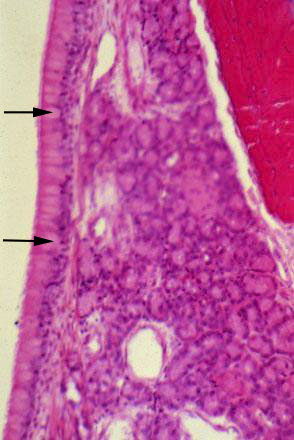 IX-5 Nasal Septum (H&E). Nasal septum lined by pseudostratified columnar epithelium (respiratory epithelium) with cilia and goblet cell (arrows). Note seromucous glands in lamina propria. A piece of bone (nasal septum) is seen (upper right).