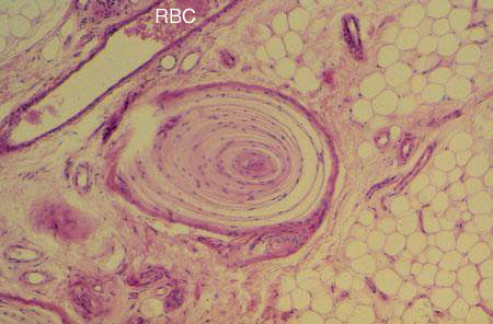 IX-50 (5) Slide 79, Fingertip, Thick Skin (H&E). High power view of a Pacinian corpuscle and adipose tissue in the hypodermis. Note endothelial cells (simple squamous epithelium) outlining vessel which contains red blood cells (RBC).