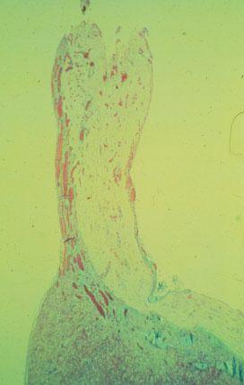 X-43 (3) K Slide 45, Human Pituitary Gland (AFT). Low power view of pars tuberalis (left) and infundibular stem (right top). Pars distalis to the bottom, pars nervosa to the right bottom. In AFT stain, collagen appears blue-green, nucleus purple-red, and erythrocytes metachromatic.