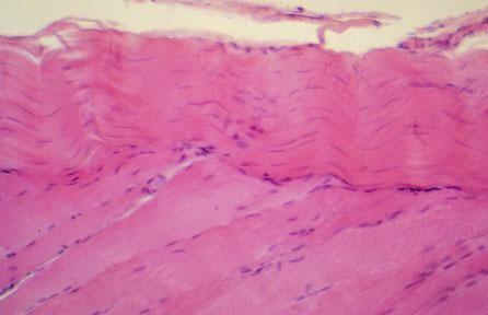 V-63 (4) Slide 15, Muscle-Tendon Junction (H&E). Muscle (bottom) is striated with euchromatic, elongated nuclei. Fibrocyte nuclei (top) of tendon are thin and slender, and heterochromatic; note the tendon consists of dense regularly arranged connective tissue (collagen, type I) which is extracellularly located.