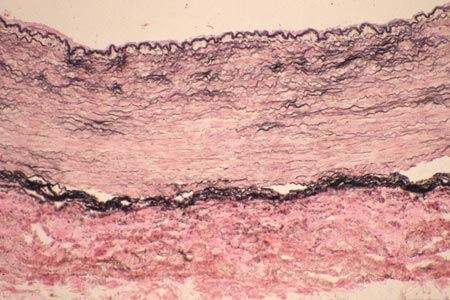 VI-29D A muscular artery in transition from an elastic artery. Note the elastic elements scattered throughout much of the media.