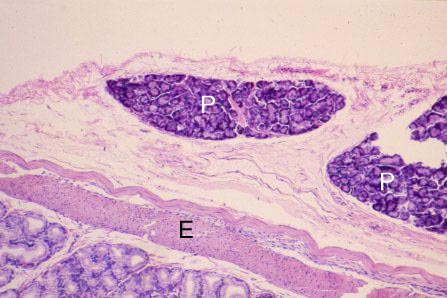 VII-55, Slide 57, Pylorus of the Stomach and Duodenum (H&E). Another section of duodenum demonstrating Brunner's glands, muscularis externae (E) and several fragments of pancreas (P). This section illustrates the close proximity of duodenum and pancreas.