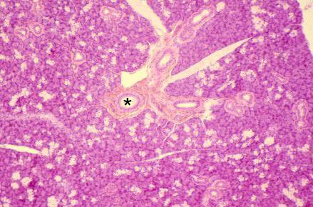 VIII-17, Slide 51, Submandibular Gland (H&E). The submandibular gland is a mixed gland, with basophilic serous acini more numerous than clear-staining mucous tubules. Note the interlobular duct (*).
