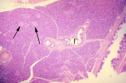 VIII-21, Slide 68, Pancreas (H&E). Low power view of pancreas. The majority of cells are basophilic-staining serous acinar cells. The islets of Langerhans (arrows) are pale-staining clusters of cells. Note the interlobular ducts (I) located within a connective tissue septum.
