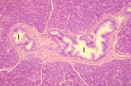 VIII-24, Slide 68, Pancreas (H&E). Large interlobular ducts (I) are present in a connective tissue septum.