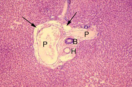 VIII-26, Slide 64, Liver (H&E). This is a portal triad consisting of portal vein (P), hepatic arteriole (H), bile duct (B), and lymphatic vessels (arrows).