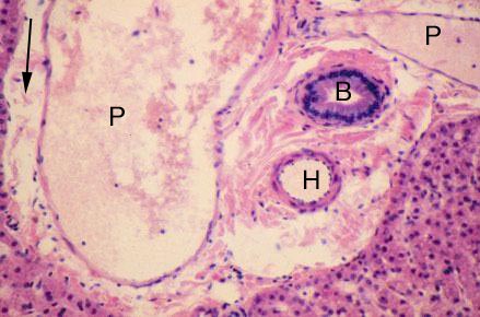 VIII-27, Slide 64, Liver (H&E). Closer view of portal triad showing portal vein (P), hepatic arteriole (H), bile duct (B), and lymphatic vessel (arrow).
