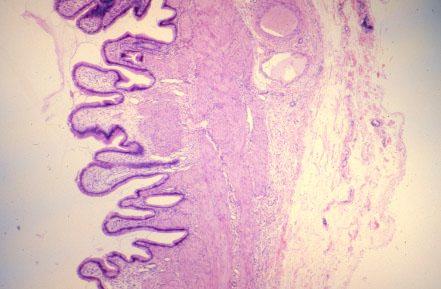 VIII-34, Slide 67, Gallbladder (H&E). The mucosa of the gallbladder forms irregular projections.