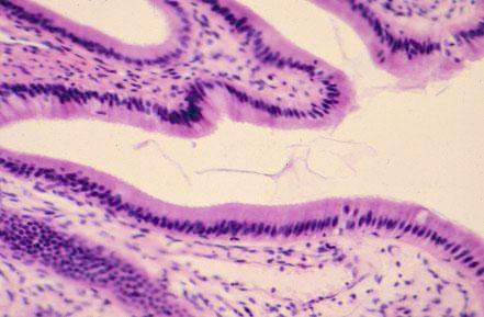 VIII-35, Slide 67, Gallbladder (H&E). Note the simple columnar epithelium lining the surface and the loose connective tissue of the lamina propria.