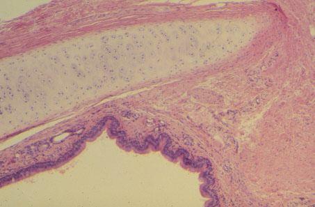 IX-12 (5) Slide 72, Trachea (H&E). Observe hyaline cartilage surrounded by perichondrium, seromucous glands in submucosa, and respiratory epithelium.