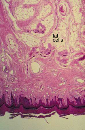IX-47 (5) Slide 79, Fingertip, Thick Skin (H&E). Low power view of the Hypodermis (bottom) with the adipose tissue (fat cells), the dermis, and a part of the epidermis are seen.
