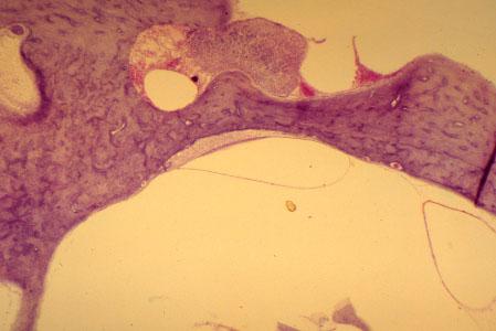X-34 (4) Slide 84, Rodent Ear (H&E). Low power view of macula (mid-screen) adjacent to temporal bone.