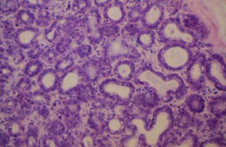 XI-69 (4) Slide 108, Active Mammary Gland (H&E). A medium power view. Note simple cuboidal epithelium of developing acini, which are stimulated in response to fetal progesterone and maternal prolactin.