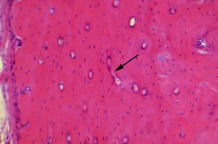 IV-28 Decalcified Bone (X.S.-H&E). Haversian systems (osteons) are well demonstrated by Haversian canals and concentrically arranged osteocytes. A Volkmann's canal is seen in the middle (arrow). An osteoclast in a Howship's lacuna can be seen next to periosteum (left).