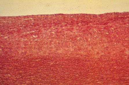 VI-25 (4) Slide 28, Aorta (H&E). Medium power view of aorta. Tunica intima is unusually thick (may be pathogenic?). Tunica media contains numerous elastic laminae synthesized by smooth muscle cells.