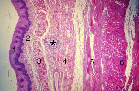 VII-35 (5) Slide 53, Esophagus (H&E). Low power view of esophagus. Observe epithelium (stratified squamous nonkeratinizing), lamina propria, muscularis mucosa, submucosa with esphageal gland (seromucous), and inner circular and outer logitudinal muscle layers (mostly skeletal, some smooth).