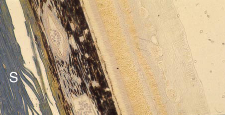 IX-28I Three layers of eye. You should be able to identify various components of the iris (on right) and choroid. The sclera (S) is on the left.