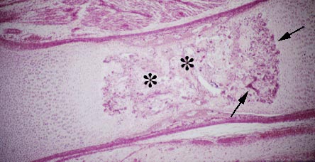 IV-31A Endochondral ossification. Cartilage erosion (*) is seen in shaft of bone along with bone deposition (arrows). Cartilagenous epiphyses are seen at both ends of this long bone.