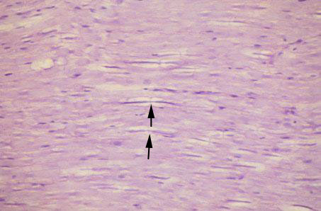 V-17 Peripheral nerve (H&E). Medium power view of peripheral nerve (longitudinal section). Two nodes of Ranvier are visible in the center (arrows). Most of the nuclei belong to Schwann cells.