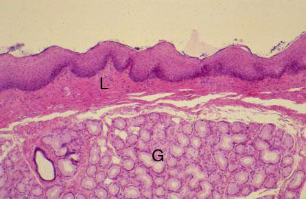 VII-11, Slide 44, Soft palate (H&E). Medium power view of lining oral mucosa. Note nonkeratinized stratified squamous epithelium, lamina propria (L), and mucous minor salivary glands (G).