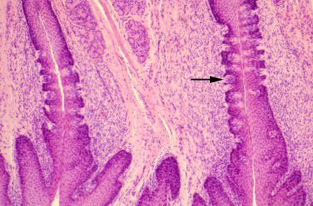 VII-34, Slide 49, Tongue, Foliate papillae from monkey (H&E). Note the taste buds (arrow) within the stratified squamous epithelium.