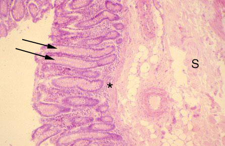 VIII-3, Slide 61, Colon (H&E). Crypts of Lieberkuhn (arrows), muscularis mucosae (*) and submucosa (S) are seen.