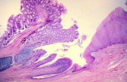 VIII-8, Slide 63, Rectoanal Junction (H&E). The rectum with simple columnar epithelium is on the left, and anal canal with stratified squamous epithelium is on the right.