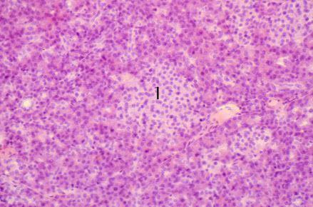 VIII-22, Slide 68, Pancreas (H&E). Note the islet of Langerhans (I) surrounded by basophilic serous acinar cells.