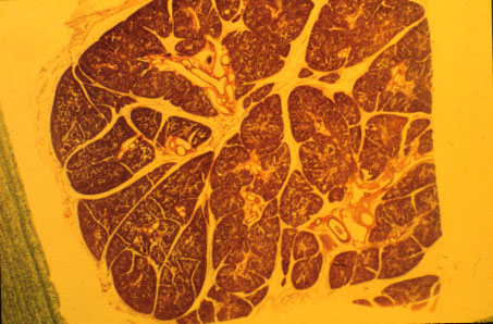K-slide 60: The lobules of salivary glands, including the submandibular, are separated by connective tissue septa. The ducts within these septa are called interlobular ducts, several of which are evident in this micrograph.