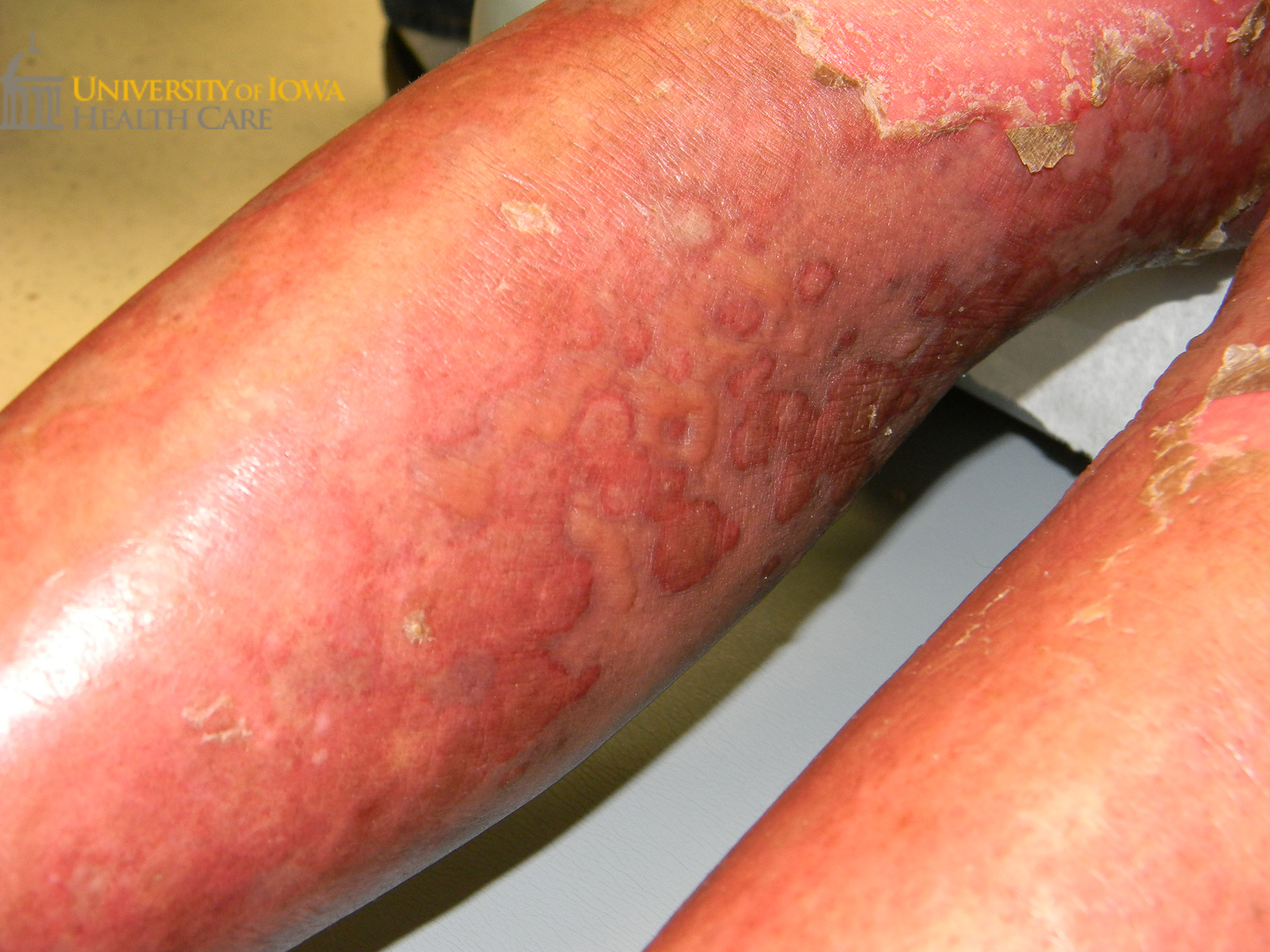 Superficial erosisons with collarette of scale and surrounding erythema on th elegs and arms. (Click images for higher resolution)